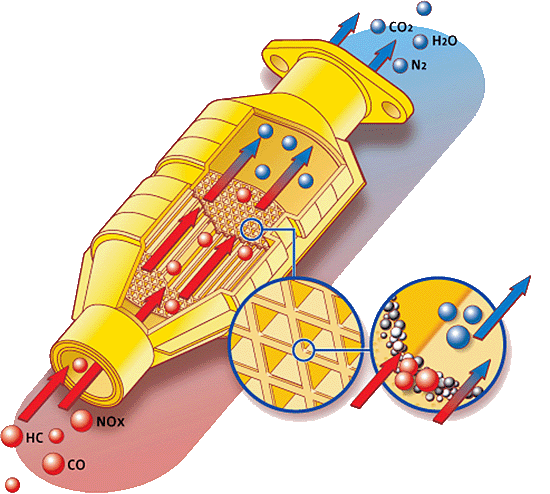 Молекулы оксида азота и монооксида углерода вместе с несгоревшими компонентами топлива попадают в тысячи микроканалов каталитического конвертера. Когда газы поступают в первый блок - платина, радий и оксид азота вступают в реакцию. Металлы притягивают к себе молекулы кислорода, а свободные атомы азота взаимодействуют между собой. Результат оксид азота превратился в кислород и азот, которые вместе составляют 99% атмосферы Земли.
